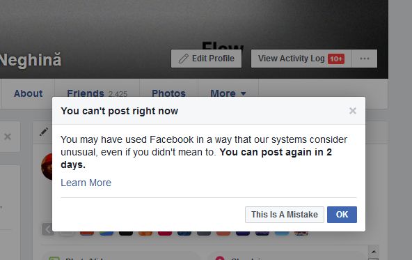 Cel mai îngrijorător mesaj primit de la Facebook în cursul săptămînii trecute a fost acesta, apărut în cursul blocării de trei zile: