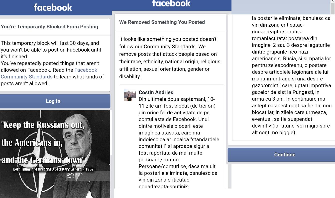 Ieri am publicat pe contul Costin Andrieș o postare despre cum Facebook considera ca o alta postare de acolo, una despre Lordul Ismay, primul sef al NATO, incalca „starndardele comunitatii”, motiv pt care a fost eliminata. Si le incalca atat de tare, ca Facebook a blocat contul timp de 7 zile.