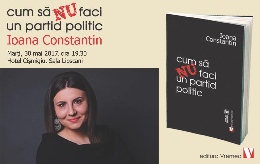 Nici nu se va sfîrși bine tumultul Bookfest-ului, cu freamătul autorilor și foșnetul cărților, că vom da năvală într-o altă lansare de carte, marți, 30 mai, ora 19.30, în Sala Lipscani a Hotelului Cișmigiu, pentru a participa la lansarea cărții tinerei, chiar foarte tinerei autoare Ioana Constantin, ”Cum să Nu faci un partid politic”.