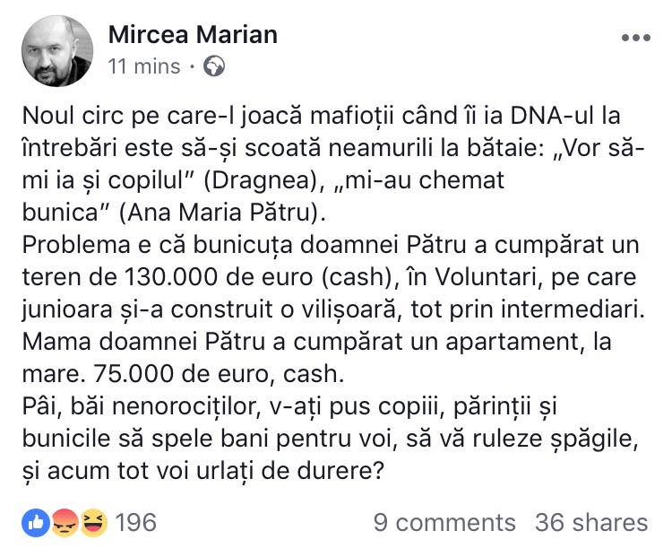 Așadar, cu ce s-a ales fiecare din părți? Familia Anei Maria Pătru, cu scandalul mediatic din care oricine care nu cunoaște (sau chiar care cunoaște) cazul poate să înțeleagă cît de nemernici sînt procurorii DNA, cum chinuie ei bătrîni de aproape 100 de ani. Cu vîlva care poate aduce, în cazul unei condamnări, măcar simpatia publică. Deloc de neglijat, de altfel, pentru cei care se întreabă cum ajunge PSD să crească în sondaje, pe măsură ce se dovedește mai corupt și mai catastrofal în ale guvernării.