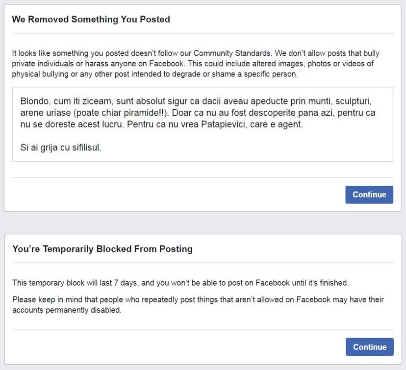 Ce știm în momentul de față este că un alt prieten, om de dreapta, a fost blocat de către platforma de aparentă socializare Facebook. Postarea incriminată este aceasta și este setată, mai grav, numai pentru prieteni. Pentru 7 zile blockul, de data asta, și pentru ce cuvînt găsiți voi neconform cu standardele unei discuții civilizate în captura de mai sus. Să fie ”blondo”, să fie ”sifilis” sau să fie ”Patapievici”?
