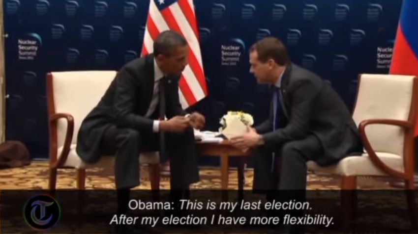 Aproape de sfîrșitul primului mandat prezidențial, domnul Obama este surprins de un microfon uitat deschis șoptindu-i domnului Medvedev, pe atunci președintele Rusiei, că dacă va cîștiga al doilea mandat, va avea mai multă flexibilitate.