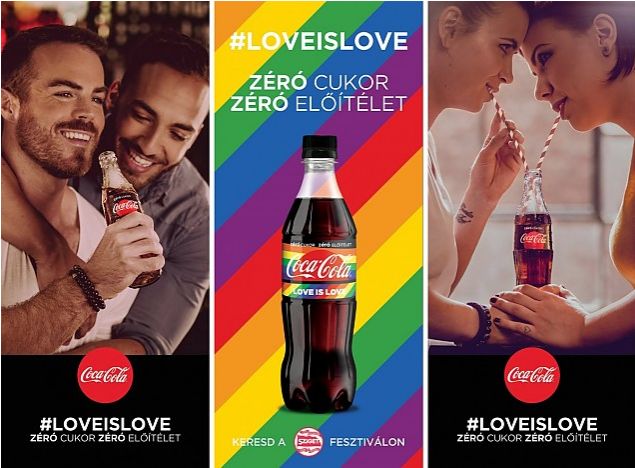 Coca Cola postase reclame provocatoare Love is love. Zero sugar, Zero prejudice, pe fond curcubeu, în toată capitala, Budapesta. Puteau fi văzute atîrnînd pe clădiri, în stațiile transportului în comun și în gări. Acolo unde copiii le puteau vedea lesne.