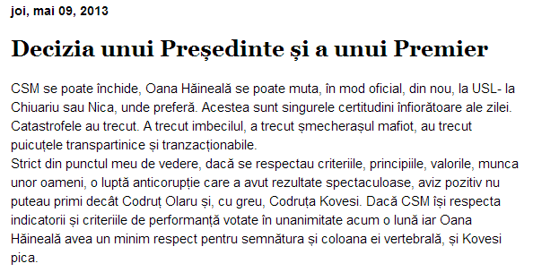 Strict din punctul meu de vedere, dacă se respectau criteriile, principiile, valorile, munca unor oameni, o luptă anticorupție care a avut rezultate spectaculoase, aviz pozitiv nu puteau primi decât Codruț Olaru și, cu greu, Codruța Kovesi. Dacă CSM își respecta indicatorii și criteriile de performanță votate în unanimitate acum o lună iar Oana Hăineală avea un minim respect pentru semnătura și coloana ei vertebrală, și Kovesi pica.”
