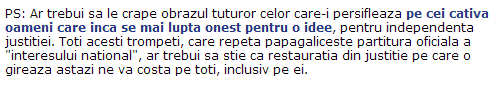 E atâta ipocrizie în tratarea subiectului ăstuia, atâta minciună sfruntată, atâta oftică dusă la extrem, de parcă de asta depinde viața vreunuia dintre agitatori. Binențeles că nu vine nimeni să demonstreze vreo afirmație din cele înșirate. Deja nici nu mai contează dacă e adevărat sau nu ce latră ei acolo. Important e că au în cine să azvârle cu noroi, au pe cine să dea vina pentru tot ce nu le-a reușit lor, au găsit o țintă nouă.
