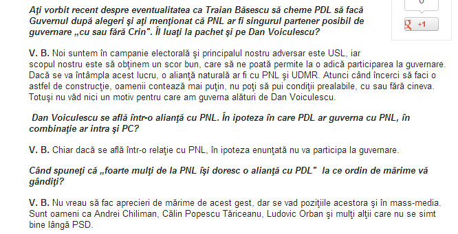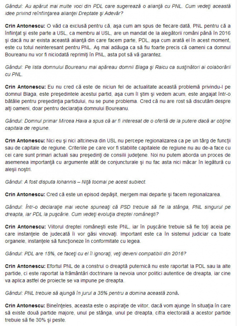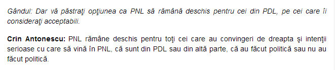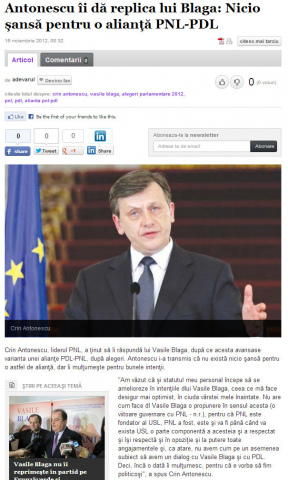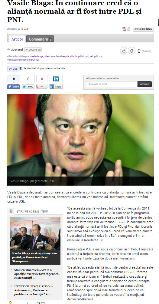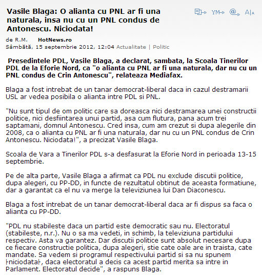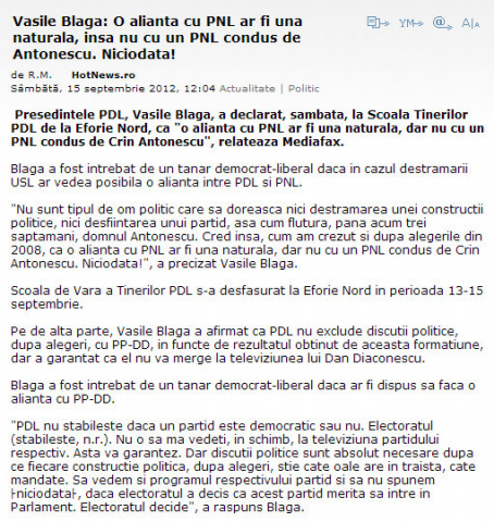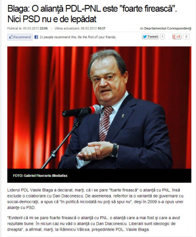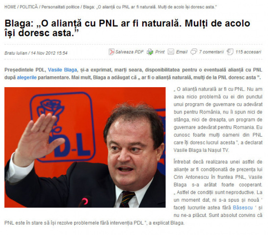 Vasile Blaga despre alianța cu PNL, în 29 august 2012: ”De această alianță vorbesc tot de la Convenția din 2011, nu de la cea din 2012. În 2012, în plus, chiar în programul politic am introdus necesitatea coagulării forțelor de centru-dreapta. Între timp PNL-ul făcuse USL-ul. În continuare cred că o alianță normală ar fi fost între PDL și PNL (…) De altfel, această alianță nu este construită pentru că s-a construit USL-ul. Părerea mea este că oricum ar fi trebuit realizată o coagulare și trebuie realizată o coagulare a forțelor de centru-dreapta. Pînă la urmă eu cred că se va polariza clasa politică românească spre două mari formațiuni”