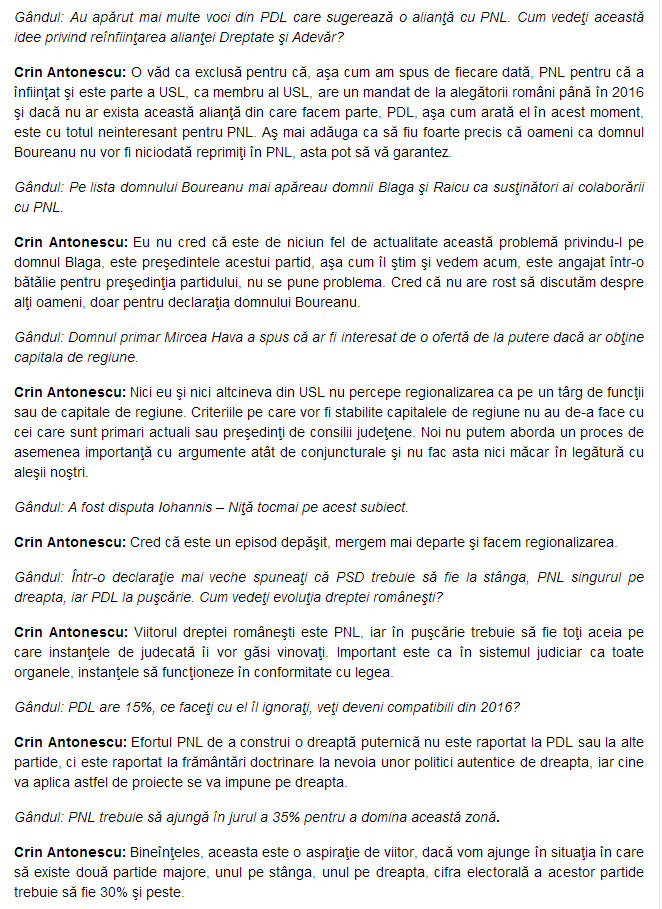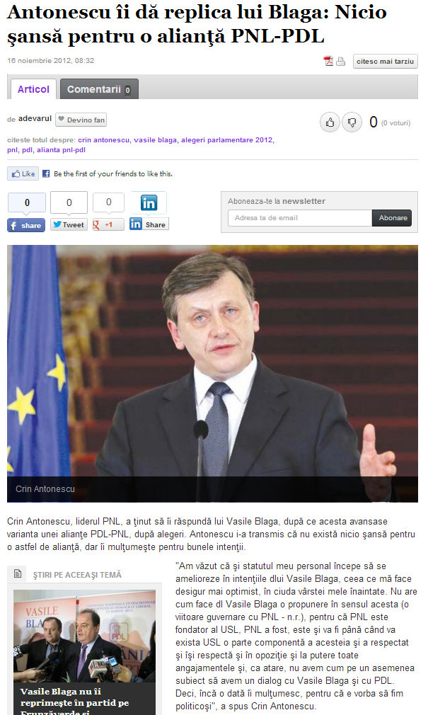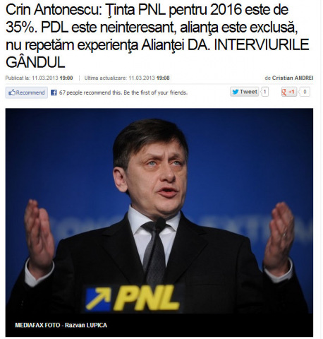 A urmat apoi o declarație în 15 septembrie în care îl excludea pe Crin din această alianță. În 14 noiembrie însă, Vasile Blaga revine la sentimente mai bune față de Crin Antonescu și elimină orice condiție pentru realizarea alianței cu PNL. Este deatlfel, cea mai demobilizatoare declarație politică făcută de vreun lider de partid în campania electorală în ultimii 23 de ani. În 26 noiembrie Vasile Blaga reînnoiește rugămințile față de PNL. Ultima declarație de dragoste datează din 6 martie, anul ăsta.