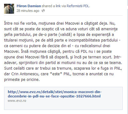Miron Damian are dreptate. Macovei și Reformiștii au cîștigat. Au arătat că pot face campanie, că pot lua țara la picior și că pot vorbi articulat, convingător și coerent oamenilor. Au venit cu cel mai coerent și mai onest program politic post-decembrist și au avut curajul și energia să intre în luptă. Dreapta nu mai poate exista în afara lor. Asta era cel mai important. Să nu lase ca dreapta să fie preluată de impostori și valeții lor.