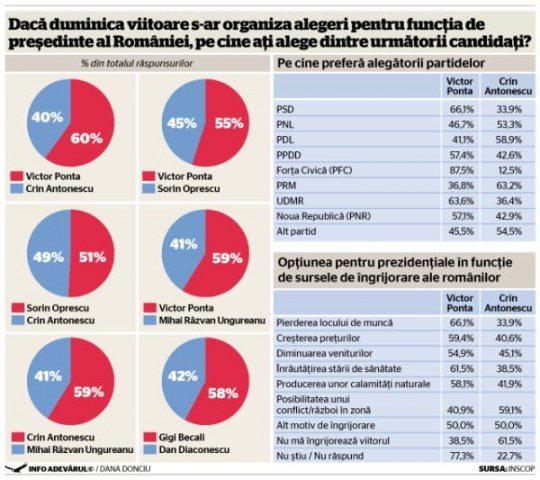 Într-o finală prezidențială, Victor Ponta l-ar bate pe Crin Antonescu cu 60% la 40%, pe MRU cu 59% la 41% și pe Oprescu cu 55% la 45%. Crin Antonescu ar pierde și în fața lui Oprescu, la limită, 49% la 51%. Dar l-ar învinge pe Mihai Răzvan Ungureanu cu 59% la 41%.