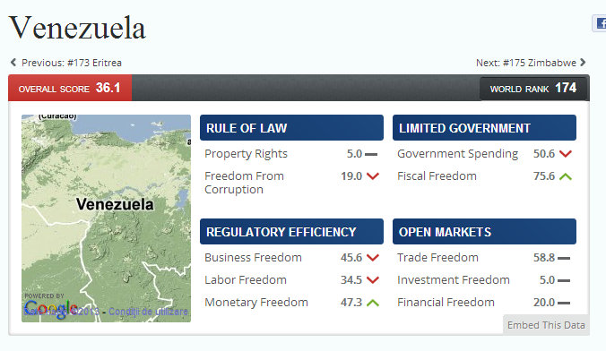 La capitolul Libertate economică (Economic Freedom Index), conform Heritage Foundation, Venezuela se prezintă în felul următor: