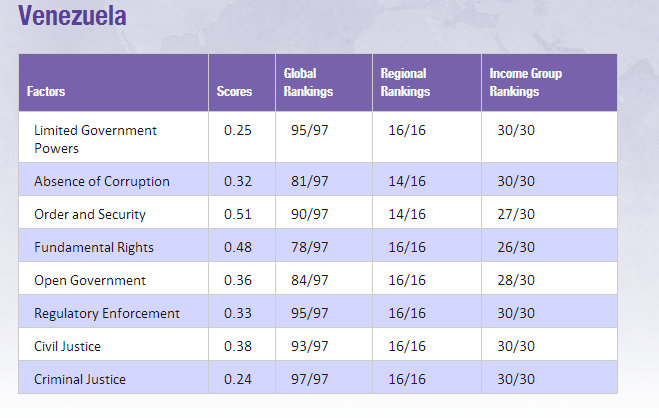 Așa stă Venezuela, experimentul socialist al lui Chavez,  la capitolul ”stat de drept”, conform The World Justice Project: