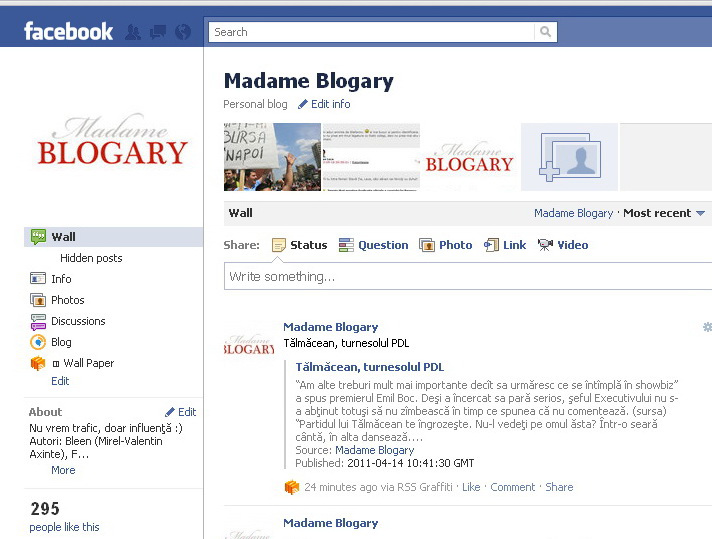 Aici găsiţi pagina de Facebook a Madamei: http://www.facebook.com/pages/Madame-Blogary/116612475035787.