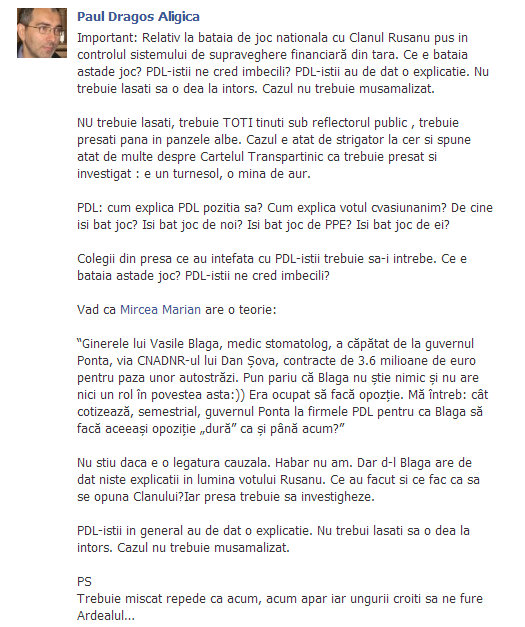 PS. Ca să fiu răutăcios, eu trebuie să spun că nu le cer pedeliștilor nicio explicație. Fiindcă nu i-am votat și nu am avut pretenții de la ei. Și nu am, și nici nu voi avea atîta timp cît va exista PDL-ul, adică cel mult un an. Dar stau pe margine și urmăresc și eu ca tot omul explicațiile pe care pedeliștii le dau alegătorilor lor. Așa, de fun.