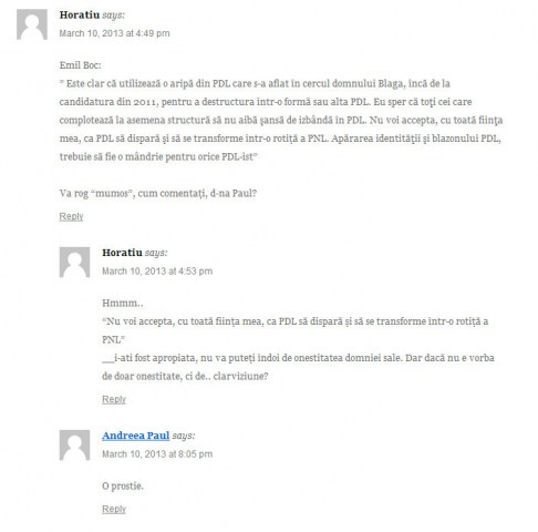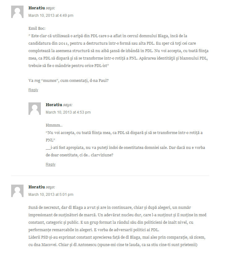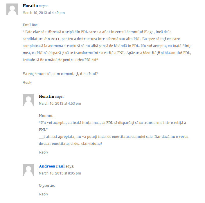 N-as vrea sa par malitios la randul meu, da ` vad ca in vremuri de-astea se vad curajosii si oamenii cu adevarat de caracter. Nu toti au curaj. Sunt aproape convins ca d-na Paul n-a avut atunci. Cine stie? riscul de a-si vedea o cariera promitatoare compromisa?