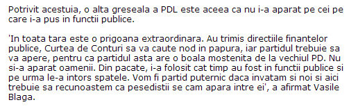 Și cum crede Blaga că ar putea un partid să-și apere oamenii din funcții publice? Instituțiile de control ale statului și justiția trebuie lăsate să lucreze. Dacă respectivii sînt nevinovați, se pot apăra, avînd dreptatea de partea lor. Dacă sînt vinovați, atunci să plătească. În niciuna dintre cele două situații partidul nu are de ce să se implice. Chiar sînt curios cum vrea Blaga să lupte PDL-ul împotriva Curții de Conturi sau direcțiilor de finanțe publice.