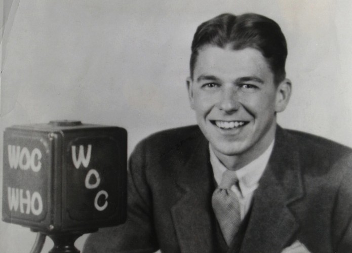 Born in Tampico, Illinois, and raised in Dixon, Reagan was educated at Eureka College, earning a Bachelor of Arts degree in economics and sociology. After graduating, Reagan moved first to Iowa to work as a radio broadcaster and then, in 1937, to Los Angeles where he began a career as an actor, first in films and later television. Some of his most notable films include Knute Rockne, All American (1940),Kings Row (1942), and Bedtime for Bonzo (1951). Reagan served as President of the Screen Actors Guild and later as a spokesman for General Electric (GE); his start in politics occurred during his work for GE. Originally a member of the Democratic Party, his positions began shifting rightward in the 1950s, and he switched to the Republican Party in 1962.