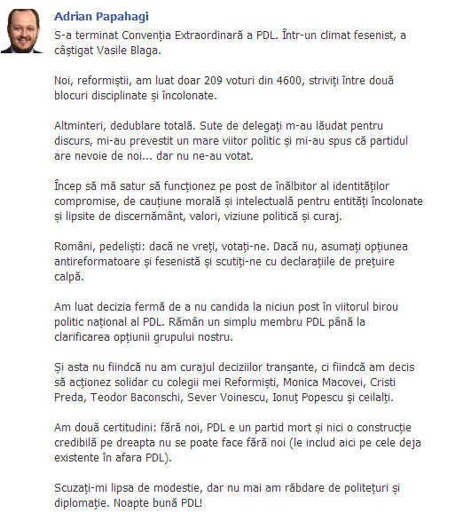 După ce Băsescu și-a luat adio de la PDL, Papahagi îi spune noapte bună.