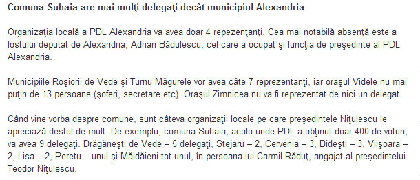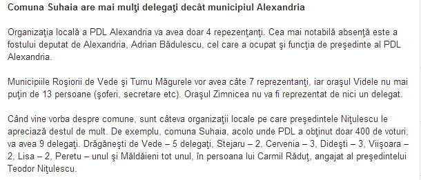 O comună în care PDL a luat doar 400 de voturi va avea mai mulți delegați decît municipiul Alexandria.