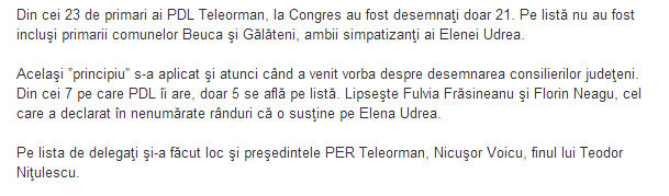 Primarii și consilierii județeni care și-au declarat susținerea pentru Elena Udrea nu au fost desemnați drept delegați. În schimb este delegat la Convenția PDL din 23 martie președintele PER Teleorman, care este și finul președintelui PDL Teleorman, susținător al lui Vasile Blaga.