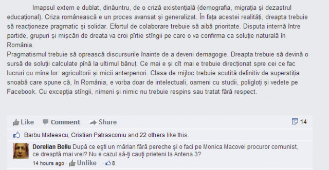 Motivul pentru care am dat like, pentru că o explicaţie e necesară în context: un om care scria de obicei strict pe un plan ideologic-aerian a emis câteva idei concrete şi plauzibile apropo de electorate, publicuri-ţintă şi dezechilibrul de facto stânga/dreapta.