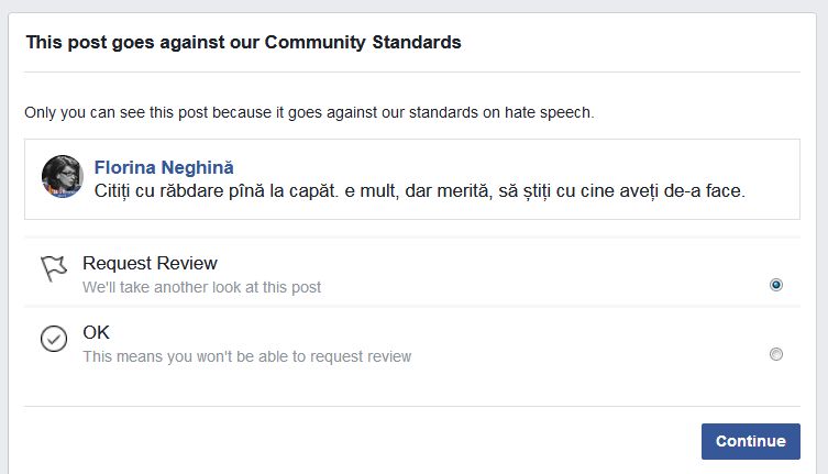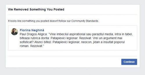 Ieri, la nici 24 de ore de la deblocarea anterioară, am fost blocată din nou de rețeaua comunistă Facebook pentru ce vedeți mai sus. Nu știu încă dacă și Profesorului Paul Aligică i-au eliminat ce nu corespunde înaltelor ”standarde” ale comunității, la mine. Posibil nu, că nu am dat share, iar eu am un… Continuă lectura Întîmplări din comunism