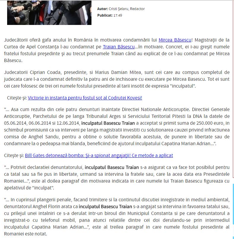 1. ”GAFĂ URIAȘĂ în justiție: Cum a fost CONDAMNAT ‘Traian Băsescu’ la închisoare” scrie stiripesurse.ro. O fi gafă, o fi cu intenție, nimeni nu are cum să știe. Dar că trebuie să te simți foarte bine cînd citești așa ceva, de asta sînt sigură. Pe lîngă toate celelalte pe care le ai pe cap. Știrea… Continuă lectura ‘Gafe’
