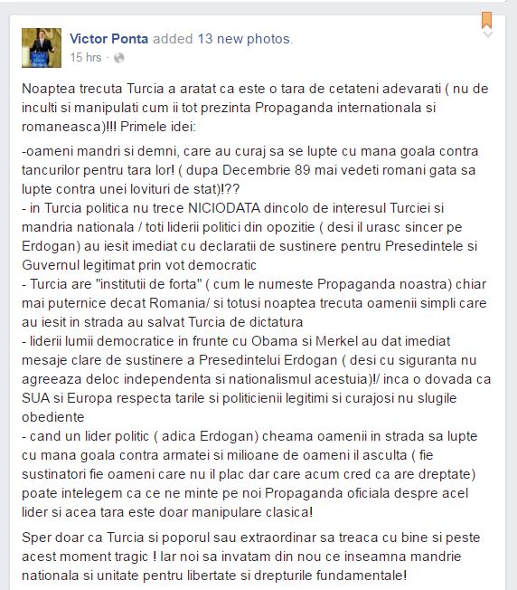 Este extrem de dificil să mai găsești ceva de spus despre Ponta, după cîte a făcut și cîte s-au spus. Și totuși, cînd pe străzile Ankarei au murit 265 de oameni, au avut loc decapitări și linșări, sînt peste 1400 de răniți și un număr neștiut de militari bătuți și umiliți, e greu să te… Continuă lectura Oroarea umana