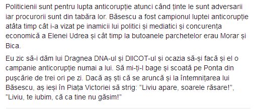 I. Deliruri. Orice credincios greșește. La ordinele FBI. Când am fost prima dată arestat i se datorează ei, ar trebui să fiu supărat… dacă ar spune ea câte ordine i-a dat Traian Băsescu… Era clar că Băsescu îi dădea ordine, cine ştie ce o înjura când bea două-trei pahare de whisky noaptea! Acum primeşte ordine… Continuă lectura 28 septembrie 2017
